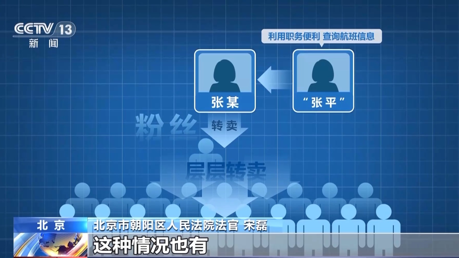 北京市朝阳区人民法院法官 宋磊:张某向上家去索取这些信息,正好她有相关的职务便利,可以查询到相关的信息,然后提供到她的下家,到了下家手里以后,下家可能还要再进行转卖。当然她的下家收到信息以后,有可能还要再向下家,再往下一层,再去贩卖,是一种层层加价的过程。