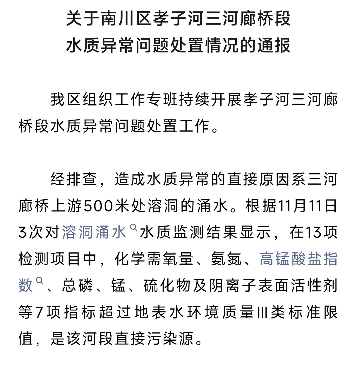 12日,南川区人民政府再次发布通报,称造成水质异常的直接原因系三河廊桥上游500米处溶洞的涌水。